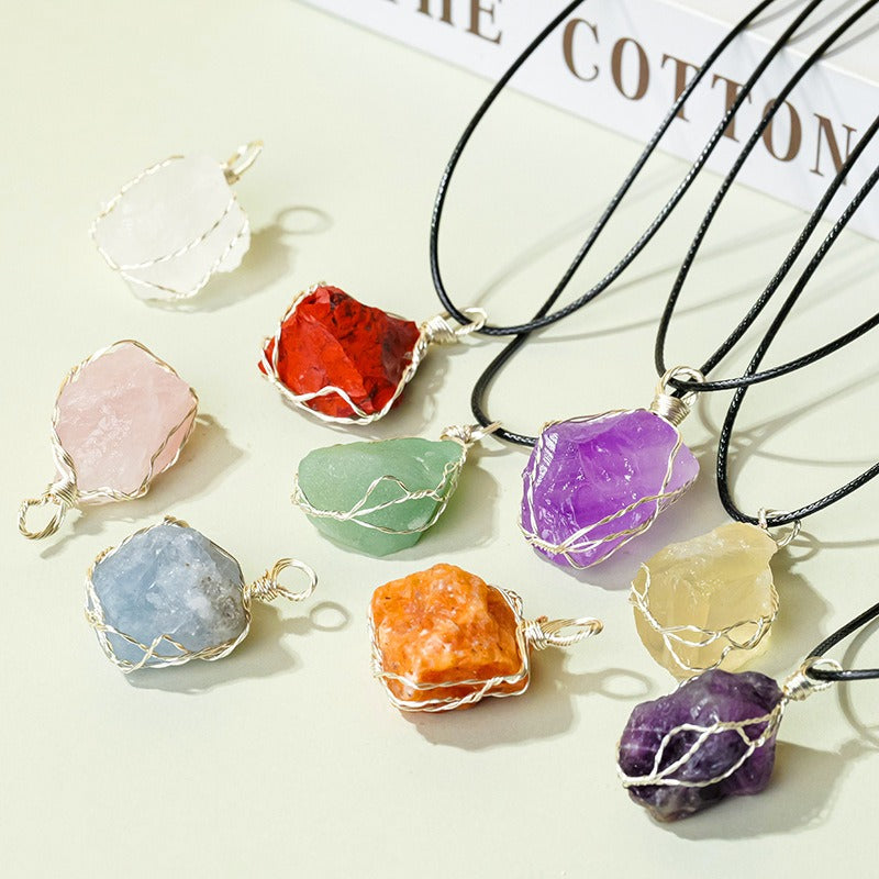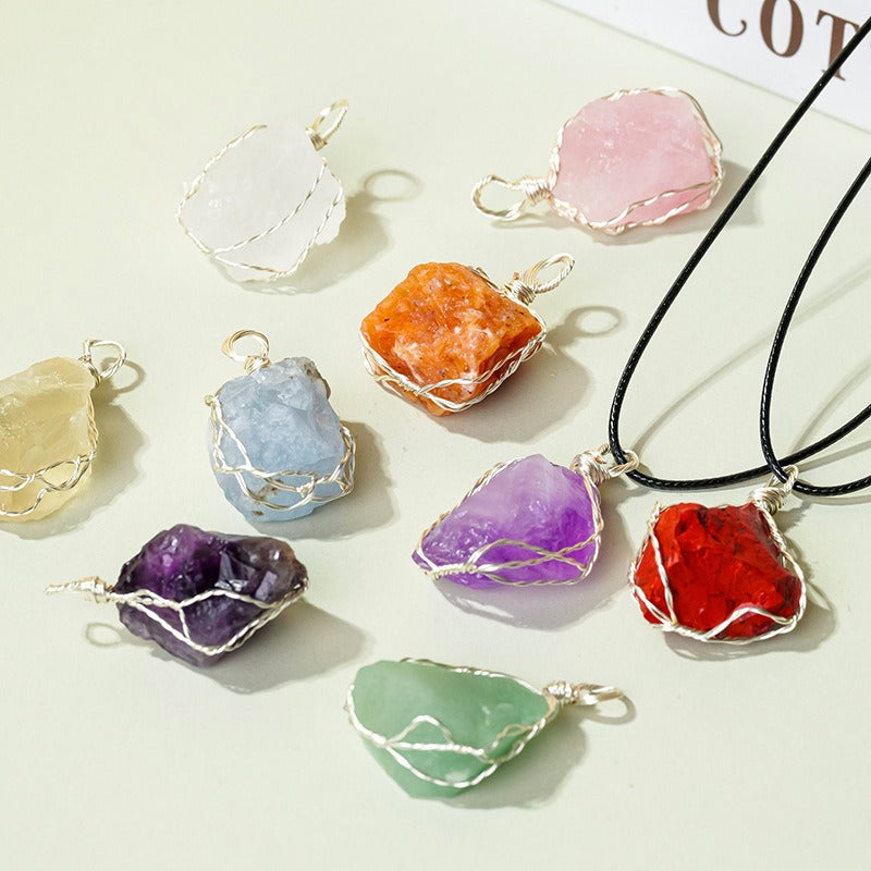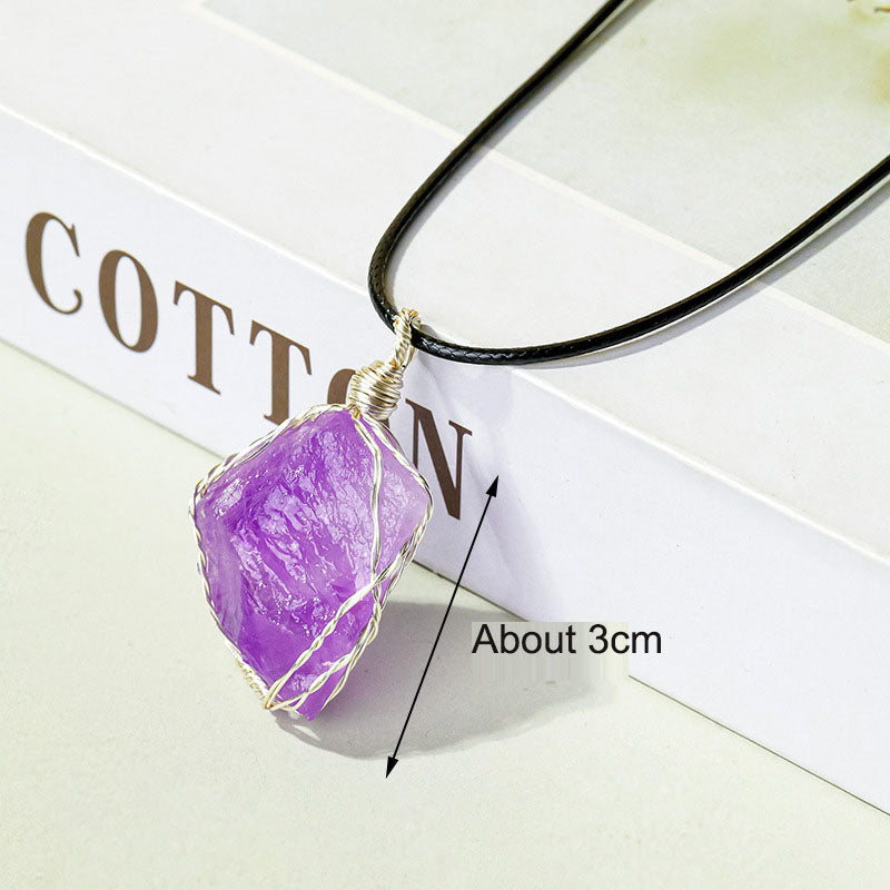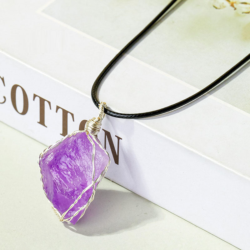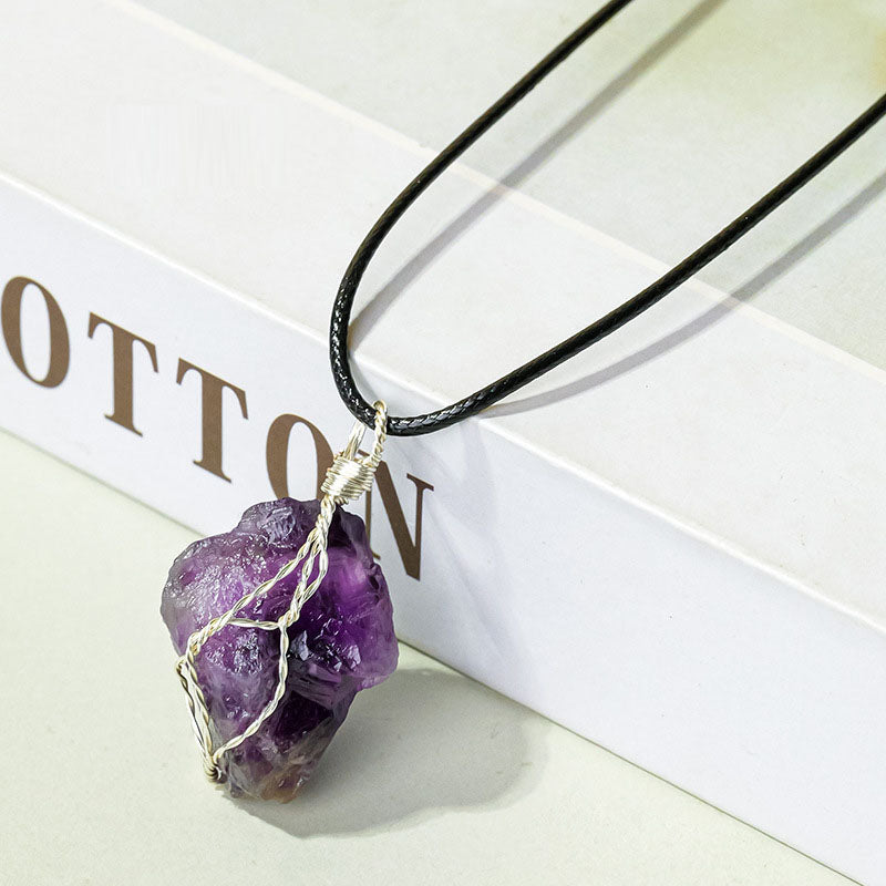 Amethyst raw stone wrapped silk pendant, handmade wrapped wire mesh bag necklace, sweater chain jewelry pendant